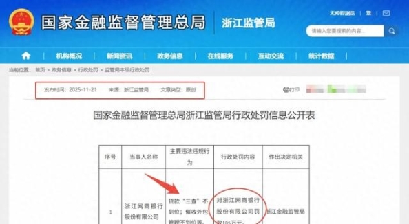 今日(11月21日),国家金融监督管理总局浙江监管局行政处罚信息公开表显示,浙江网商银行因贷款“三查”不到位、催收外包管理不到位等,被浙江金融监管局罚款10...