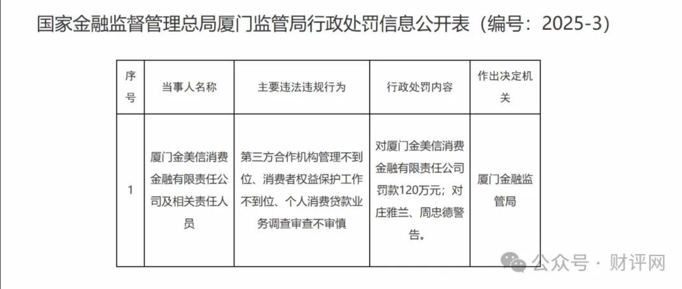 12月1日,国家金融监督管理总局厦门监管局披露行政处罚信息公开表,金美信消金因涉及第三方合作机构管理不到位、消费者权益保护工作不到位、个人消费贷款业务调查审查不审慎违法违规行为,被罚款120万元。